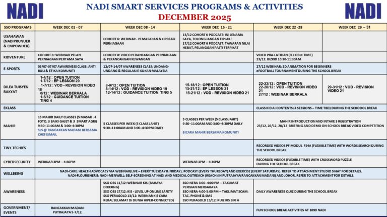 Tarikh: 18 Disember 2025Masa: 3.00 Petang – 4.30 PetangTempat : NADI Felda SoehartoPeserta : Orang Awam Tujuan Program Cybersecurity ini bertujuan untuk meningkatkan kesedaran awam tentang risiko kamera tersembunyi dan ancaman privasi. Selain itu, webinar ini juga memberi pendedahan kepada orang ramai mengenai cara […]